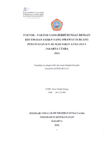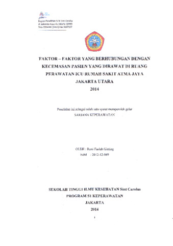 Ginting, Roni Faslah (2014) Faktor – Faktor yang Berhubungan Dengan Kecemasan Pasien yang Dirawat Di Ruang Perawatan ICU Rumah Sakit Atma Jaya Jakarta Utara. Undergraduate thesis, STIK Sint carolus.