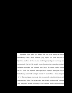Fransiska, Maria (2013) Faktor–Faktor yang berhubungan dengan tingkat terjadinya hipertensi pada usia remaja dan dewasa muda di Jakarta dan Bekasi 2013. Undergraduate thesis, Nursing Study Program.